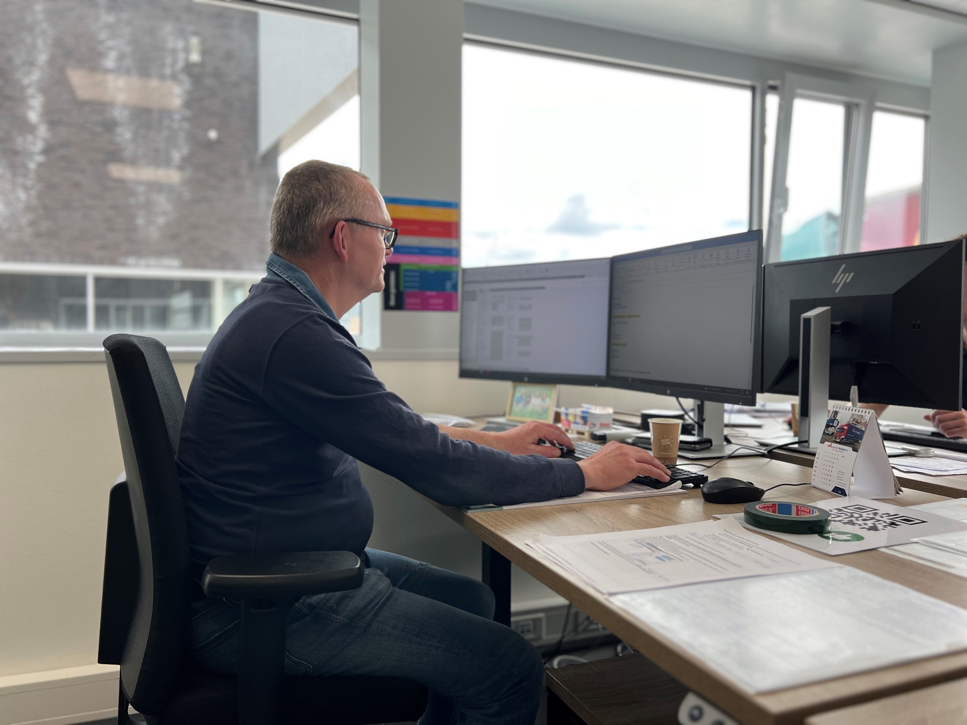 7.15u beginnen - kopje koffie - mail checken - VBS nalopen - (spoed)transporten regelen - collega’s helpen - planning checken - lunchen - mail checken - voorraden controleren - lijsten bijwerken - kopje koffie met collega's - transporten nalopen - contact met vervoerders - collega’s helpen - uren invullen - 17.30 naar huis